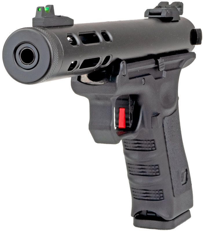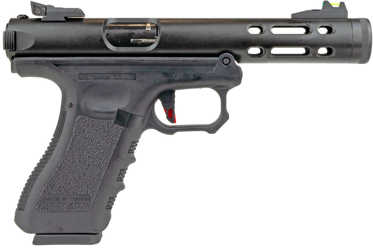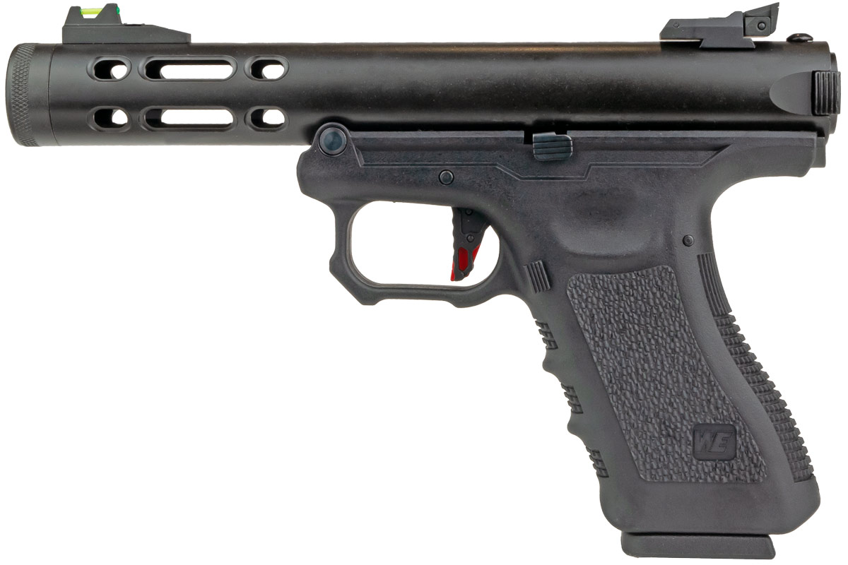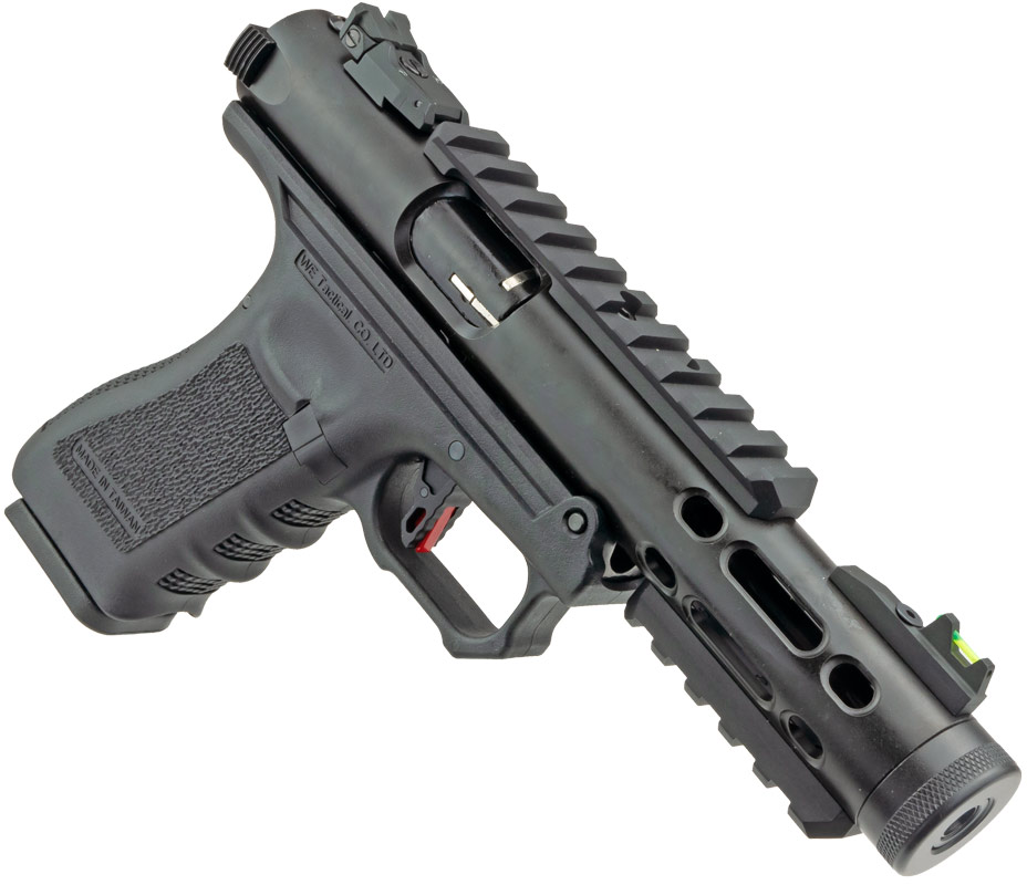 WE Galaxy gaspistol med kraftigt slag tillbaka och möjlighet för full / semi auto WE G-serien Blow Back-pistol är byggd på den klassiska ramen med en unik design på pipor. Pistolen kommer med möjlighet till full auto och skenan för montering ingår i paketet. WE G-serie galaxy har justerbart bakre sikte och fiberoptisk front. Bra gaspistol med kraftigt bakslag.