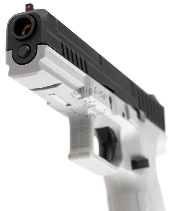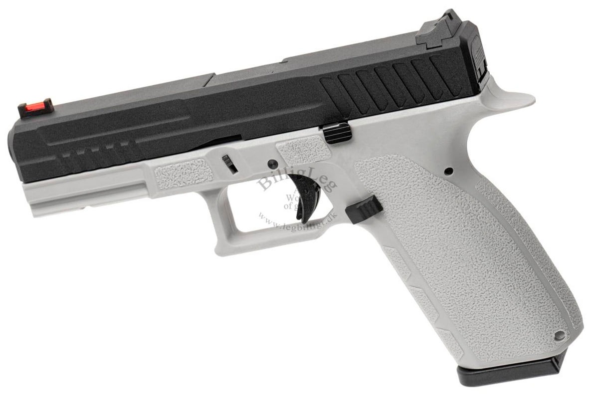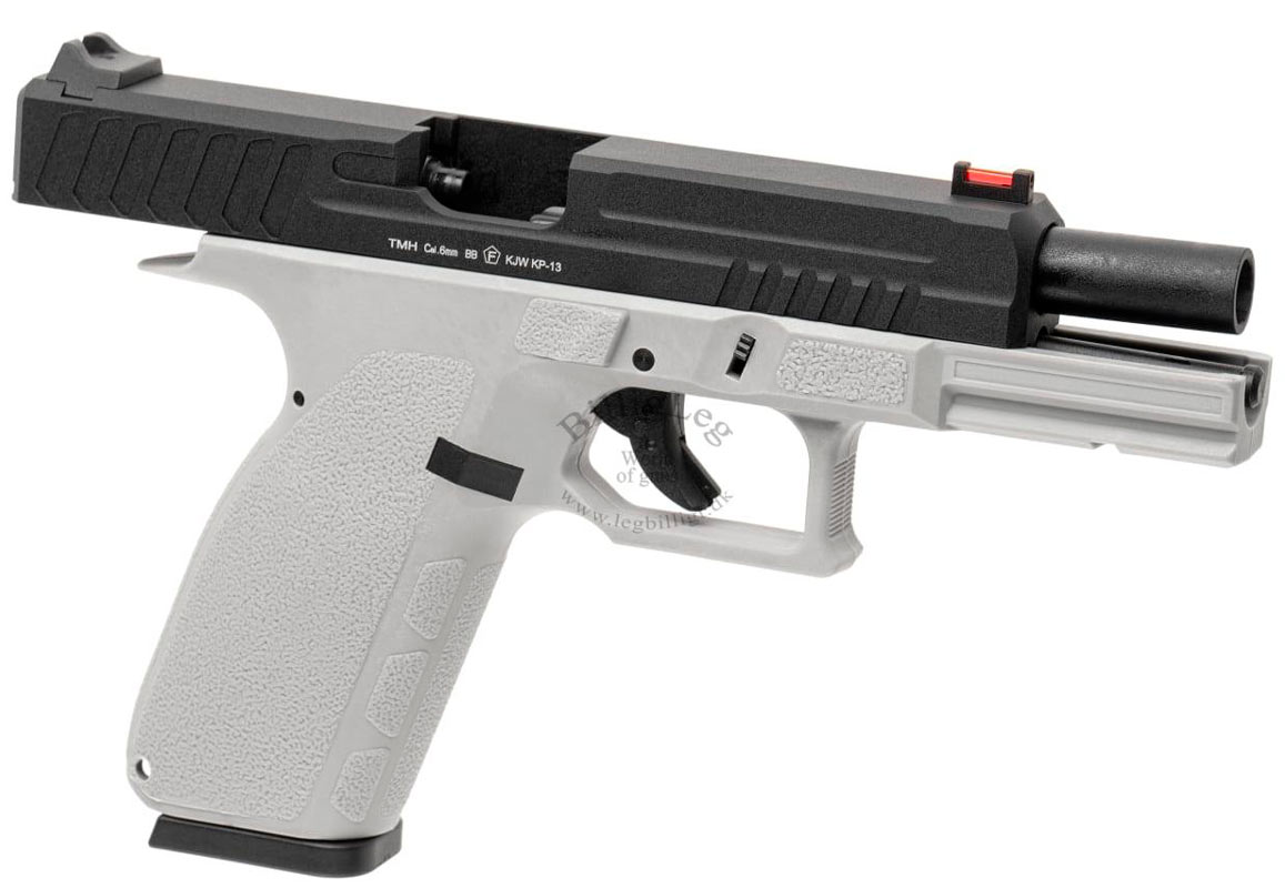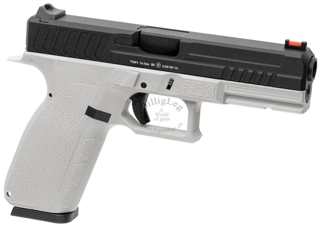 Kj works KP-13 gaspistol som kommer med svart metall mantel och grå fiberram. Gaspistolen Kj works KP-13 har ett fiberoptiskt sikte fram som gör det lättare för skytten att "fånga" målet. Pistolen har en inbyggd säkerhet i avtryckaren och kommer med ett kraftfullt Blow Back.
