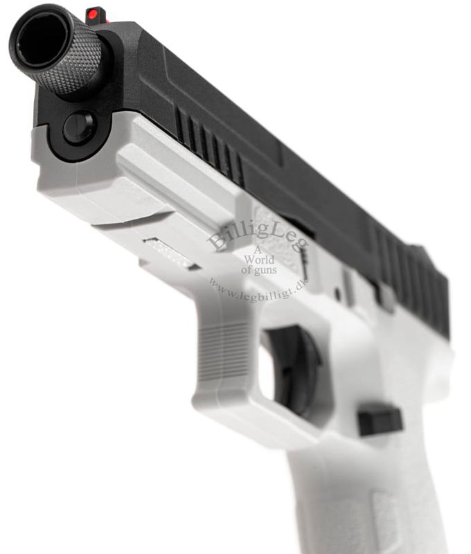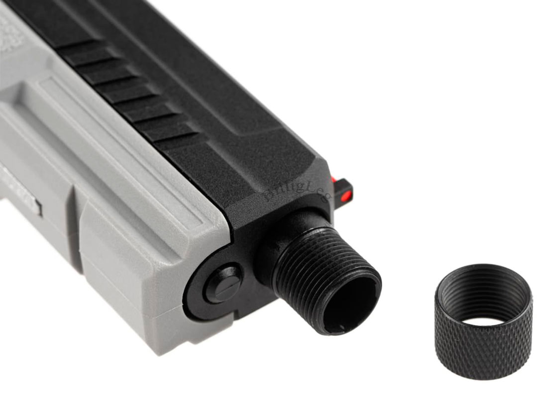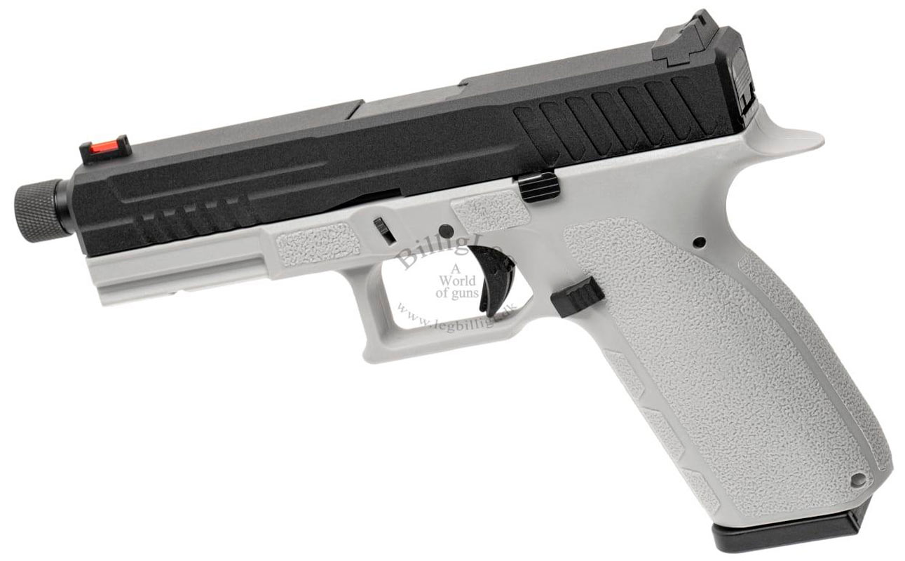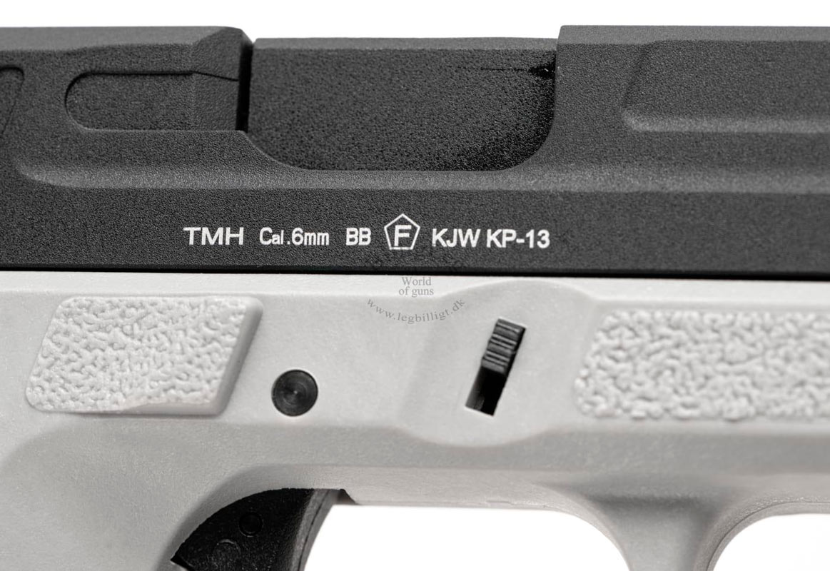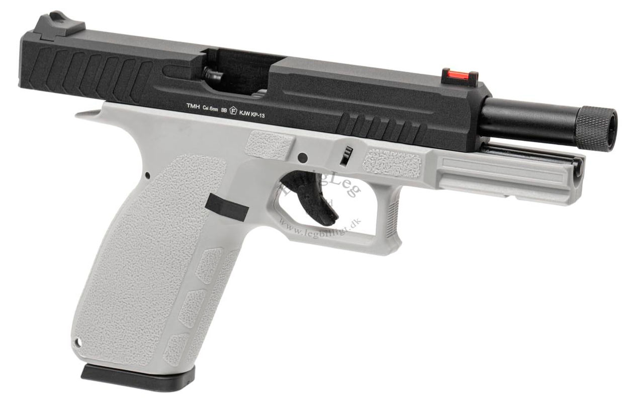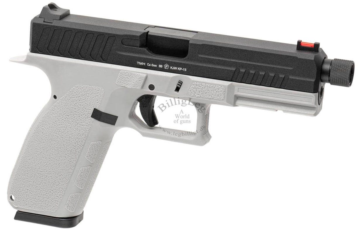 Kj works KP-13 TBC gaspistol som kommer med svart metall mantel och grå fiberram. Pistolen är förberedd för ljuddämpare, med 14 mm CCW-gänga. Kj works KP-13 TBC Gaspistol har ett fiberoptiskt frontsikte som gör det lättare för skytten att "fånga" målet. Pistolen har en inbyggd säkerhet i avtryckaren och kommer med ett kraftfullt Blow Back.