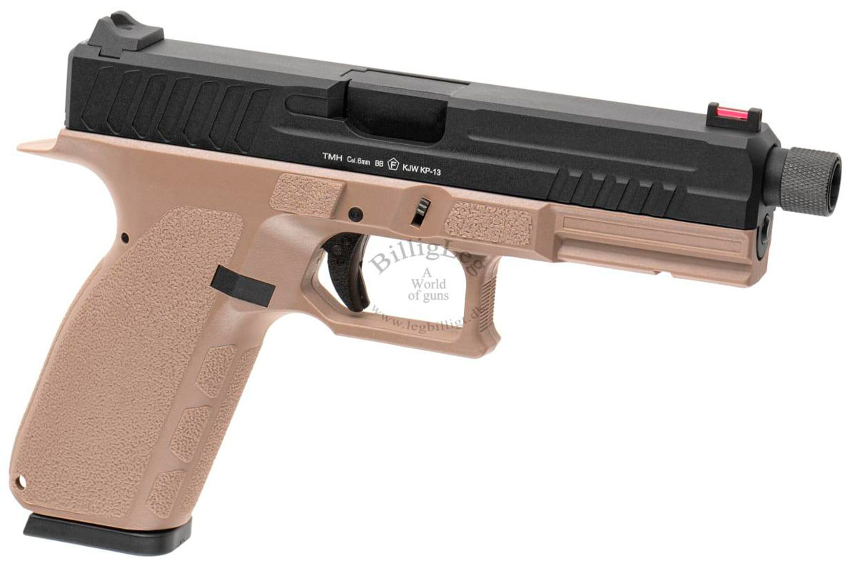 Kj works KP-13 TBC gaspistol som kommer med svart metall mantel och ram av ökenfiber. TBC-pistolen är förberedd för ljuddämpare med 14 mm CCW-gänga. Gaspistolen Kj works KP-13 har ett fiberoptiskt sikte fram som gör det lättare för skytten att "fånga" målet. Pistolen har en inbyggd säkerhet i avtryckaren och kommer med ett kraftfullt Blow Back.