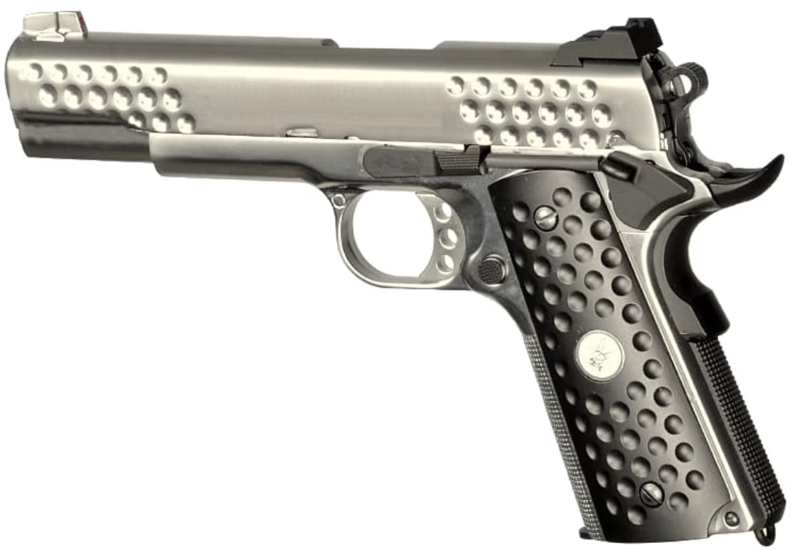 WE Knight Hawk silver helmetall WE Knight Hawk silver M1911 modell, som är helt tillverkad av metall med en unik design. Knight Hawk silverpistolen är tillverkad av WE som är känt för att producera högkvalitativa airsoft-modeller med snygga detaljer. Knight Hawk silver är inget undantag, pistolen är helt gjord av metall och med en design man inte ser så ofta, vilket hjälper till att Knight Hawk-serien lite mer unik. Pistolen kommer med ett bra hål som säkerställer en bra och stabil kulbana. En snygg och extremt stabil pistol som skjuter bra. Data.: * Skjuter ca. 95 m/s (mätt med 0,20 g kulor ) * Magasinet rymmer 15 kulor . * Längden är 22,5 cm. * Pipan mäter 11,2 cm. * Vikten är 945g * Hop up är justerbar. * Kraftfullt gasblås tillbaka. * Materialet är metall med några plastdelar. * Färgen är krom/silver.. * Tillverkad av WE Paketet innehåller: * WE Knight Hawk silver * Magasin för pistolen. * Manual för pistolen.