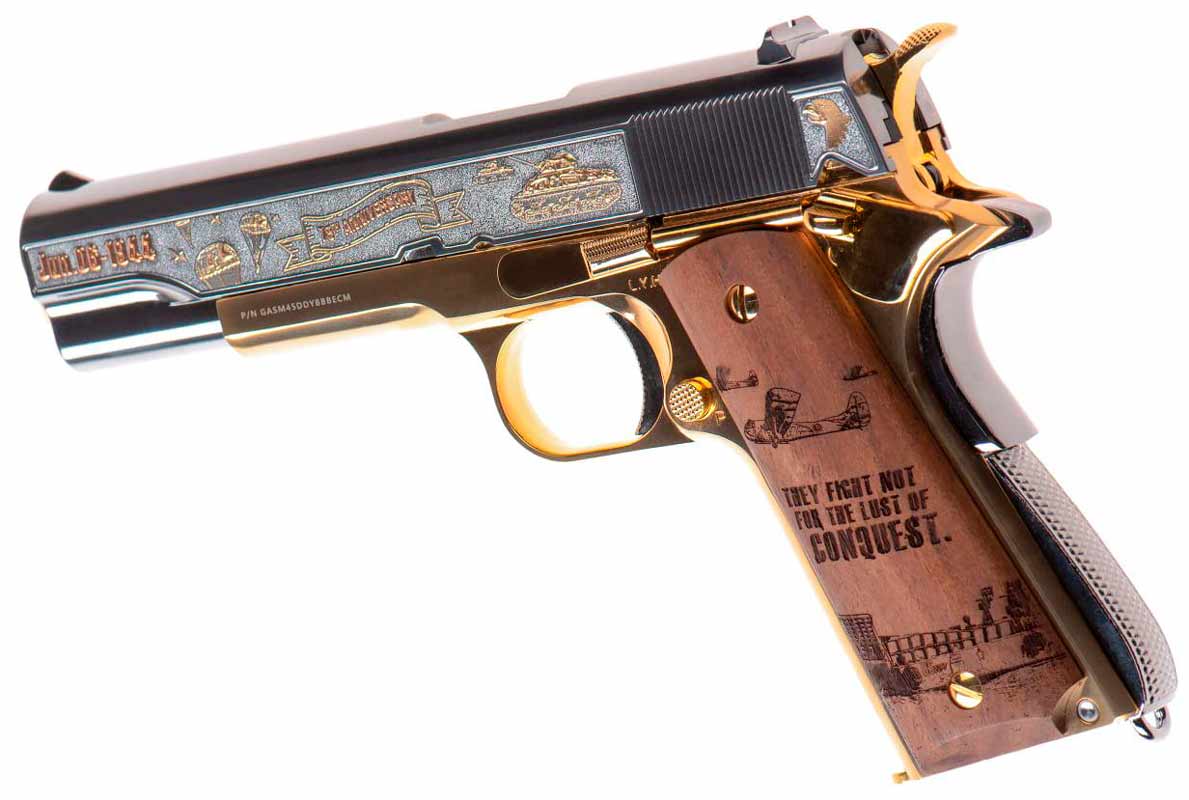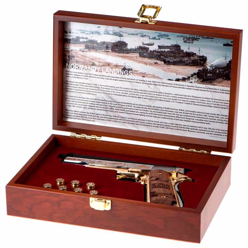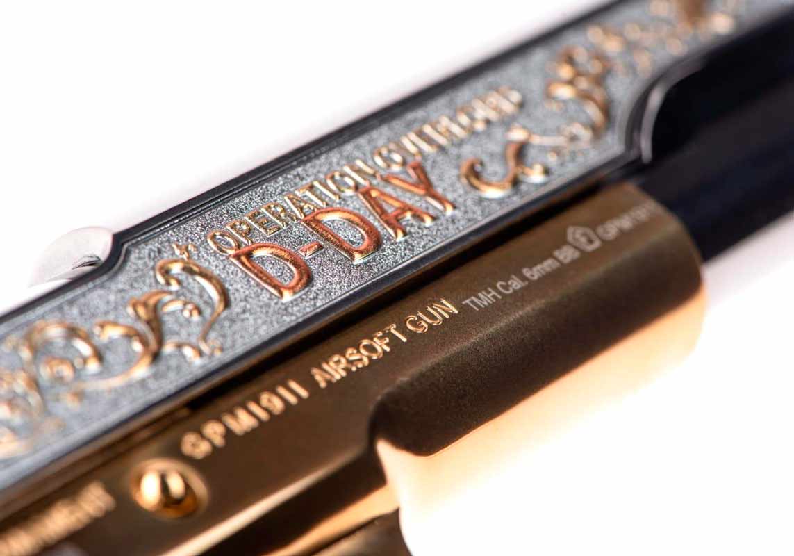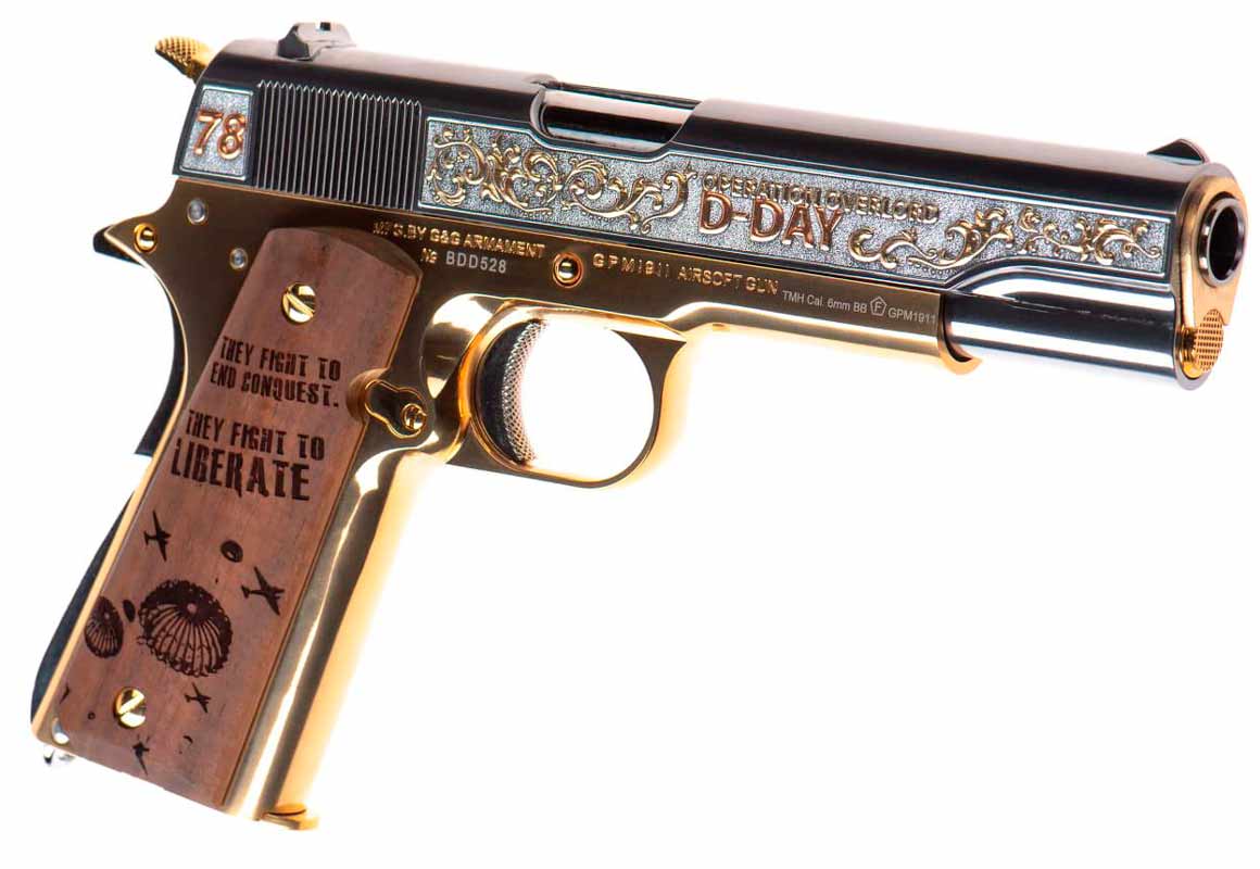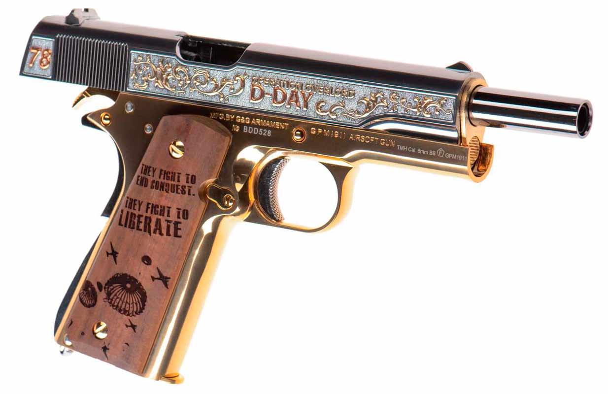 Pistolen för dig som vill ha något helt unikt. GPM1911 D-Day Limited Version är en M1911-modell med stor omsorg om detaljer, och pistolen levereras i en vackert fodrad trälåda med 7 attrapppatroner, samt en liten hyllning till soldaterna som gick i land på D-dagen. Pistolen är tillverkad helt i metall och har så många detaljer att det är nästan omöjligt att beskriva dem alla här. Pistolgreppet är tillverkat av riktigt trä, som är vackert graverat, och om du väljer att skjuta med pistolen kommer du att uppleva bra blowback och en pistol som helt enkelt skjuter bra. Låt bilderna tala för sig själva..