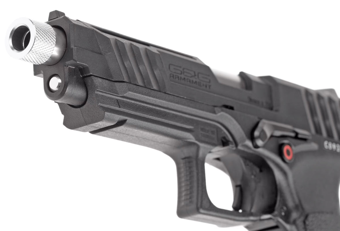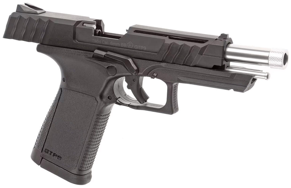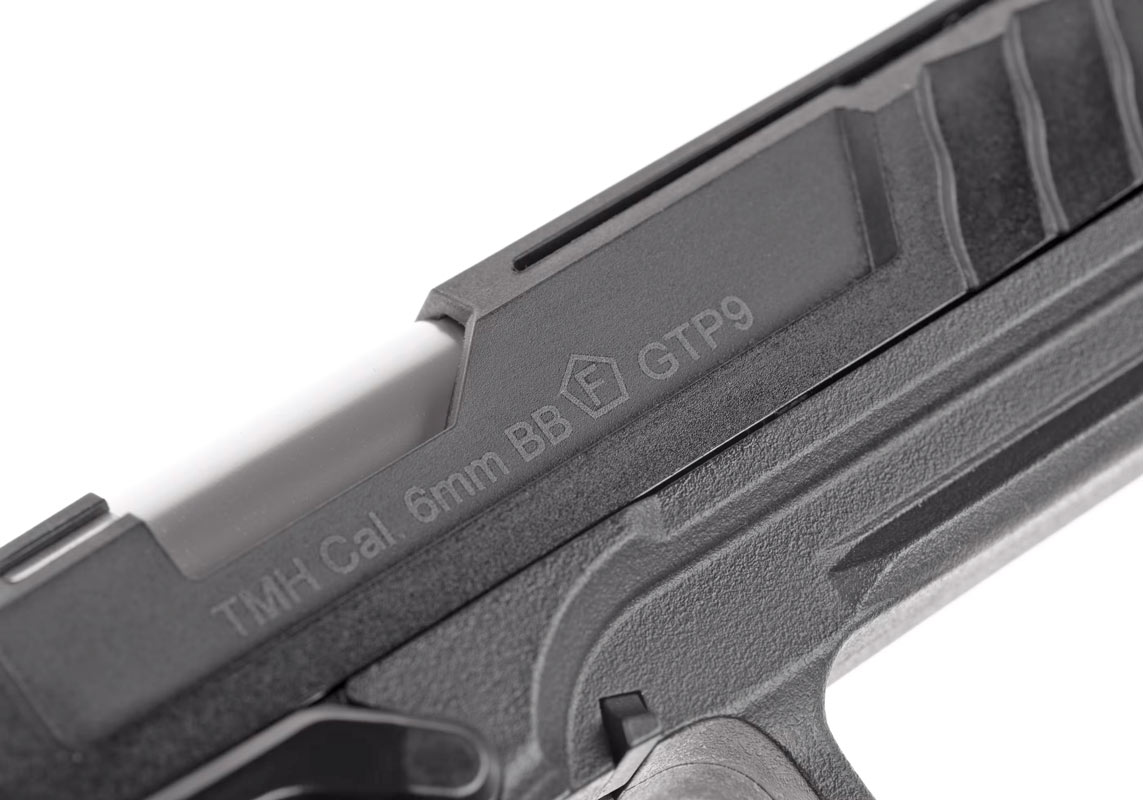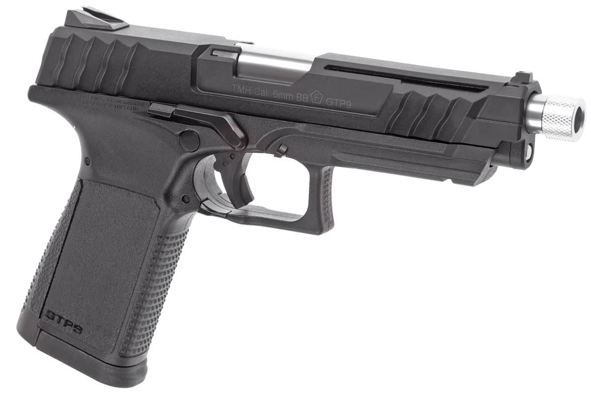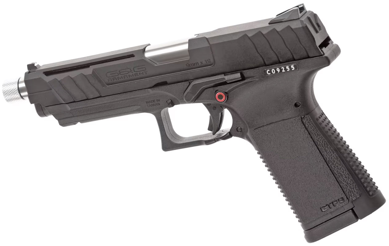 GTB 9-pistolen är en helt unik pistol från G&G som är tillverkad med metall mantel och fiberstomme. Pistolens gaskammare är utrustad med keramiska delar, vilket ger bättre fördelning av gasen så att man inte uppnår riktigt samma kylning som man känner till från gasvapen, och därmed också en mer stabil kulbana även på de sista kulor . Hop-up-funktionen på pistolen justeras på ett helt nytt och enkelt sätt, så du behöver inte ta bort sliden för att justera. Magasinet är utrustat med ett filter som säkerställer att alla föroreningar sorteras bort. Pistolen levereras i ett vapenfodral så den är enkel att transportera. Pistolen är helt svart med en kromad yttre pipa, och magasinutlösaren kan användas på båda sidor av pistolen. Pistolen har en inbyggd säkerhetsspärr i avtryckaren för att säkerställa att pistolen inte avfyras oavsiktligt.
