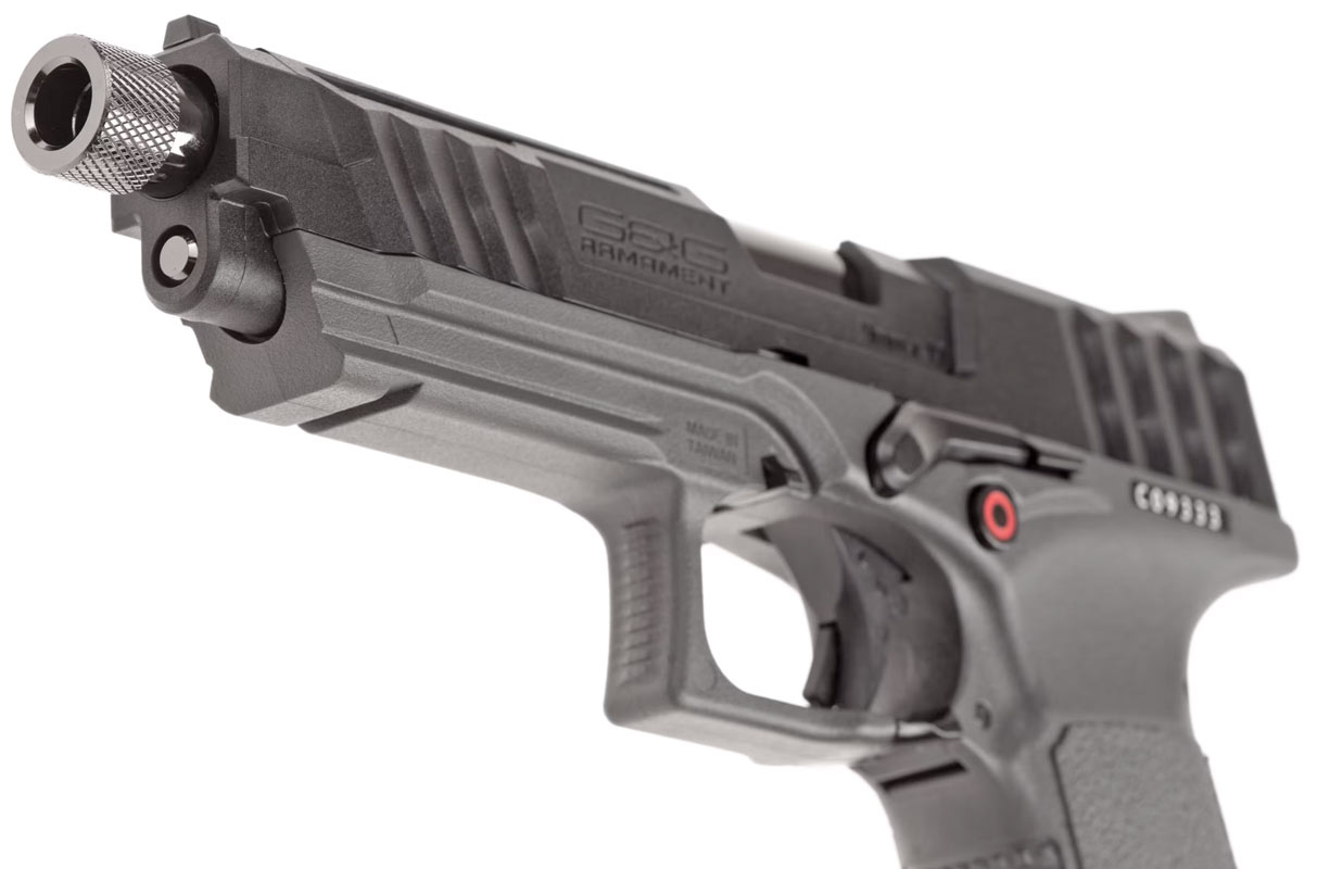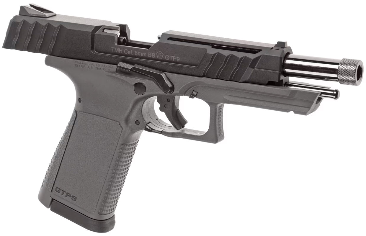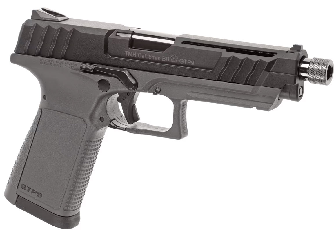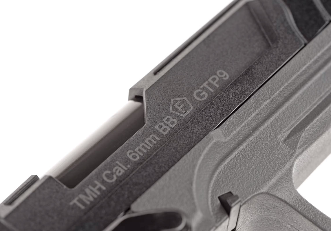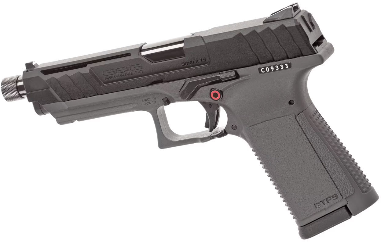 GTB 9-pistolen är en helt unik pistol från G&G som är tillverkad med metall mantel och fiberstomme. Pistolens gaskammare är utrustad med keramiska delar, vilket ger bättre fördelning av gasen så att man inte uppnår riktigt samma kylning som man känner till från gasvapen, och därmed också en mer stabil kulbana även på de sista kulor . Hop-up-funktionen på pistolen justeras på ett helt nytt och enkelt sätt, så du behöver inte ta bort sliden för att justera. Magasinet är utrustat med ett filter som säkerställer att alla föroreningar sorteras bort. Pistolen levereras i ett vapenfodral så den är enkel att transportera. Pistolen är i svart/grå färg med kromad ytterpipa, och magasinutlösaren kan användas på båda sidor av pistolen. Pistolen har en inbyggd säkerhetsspärr i avtryckaren för att säkerställa att pistolen inte avfyras oavsiktligt.