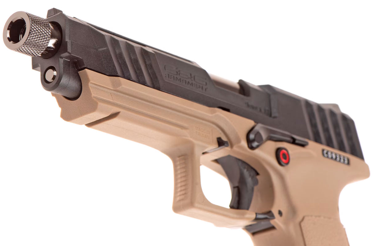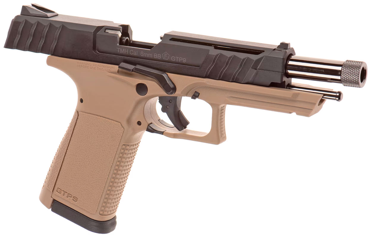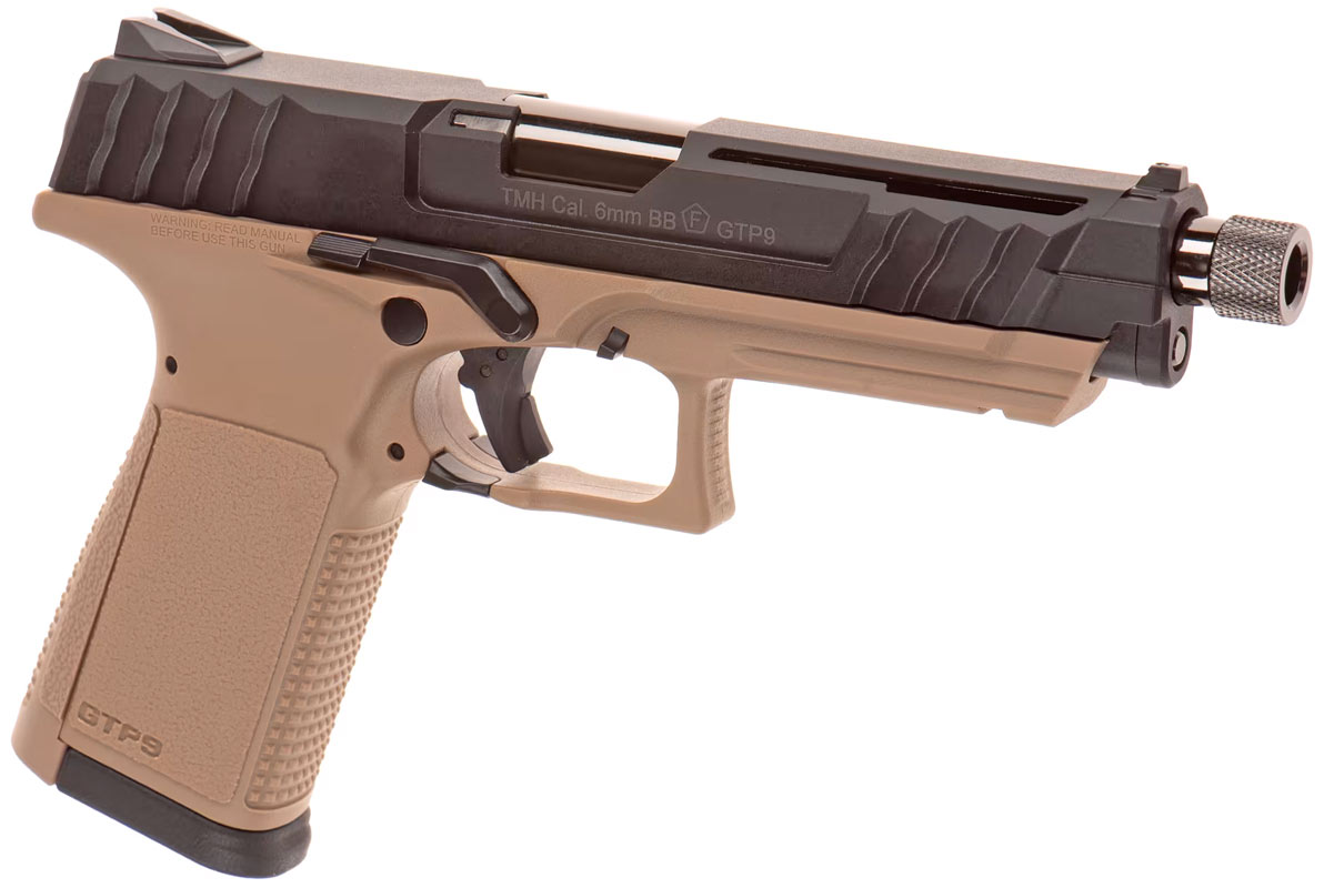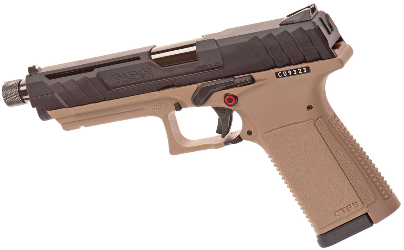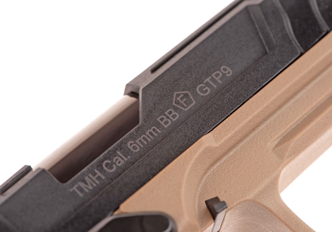 GTB 9-pistolen är en helt unik pistol från G&G som är tillverkad med metall mantel och fiberstomme. Pistolens gaskammare är utrustad med keramiska delar, vilket ger bättre fördelning av gasen så att man inte uppnår riktigt samma kylning som man känner till från gasvapen, och därmed också en mer stabil kulbana även på de sista kulor . Hop-up-funktionen på pistolen justeras på ett helt nytt och enkelt sätt, så du behöver inte ta bort sliden för att justera. Magasinet är utrustat med ett filter som säkerställer att alla föroreningar sorteras bort. Pistolen levereras i ett vapenfodral så den är enkel att transportera. Pistolen är i svart/brun dual tone med kromad ytterpipa, och magasinutlösaren kan användas på båda sidor av pistolen. Pistolen har en inbyggd säkerhetsspärr i avtryckaren för att säkerställa att pistolen inte avfyras oavsiktligt.