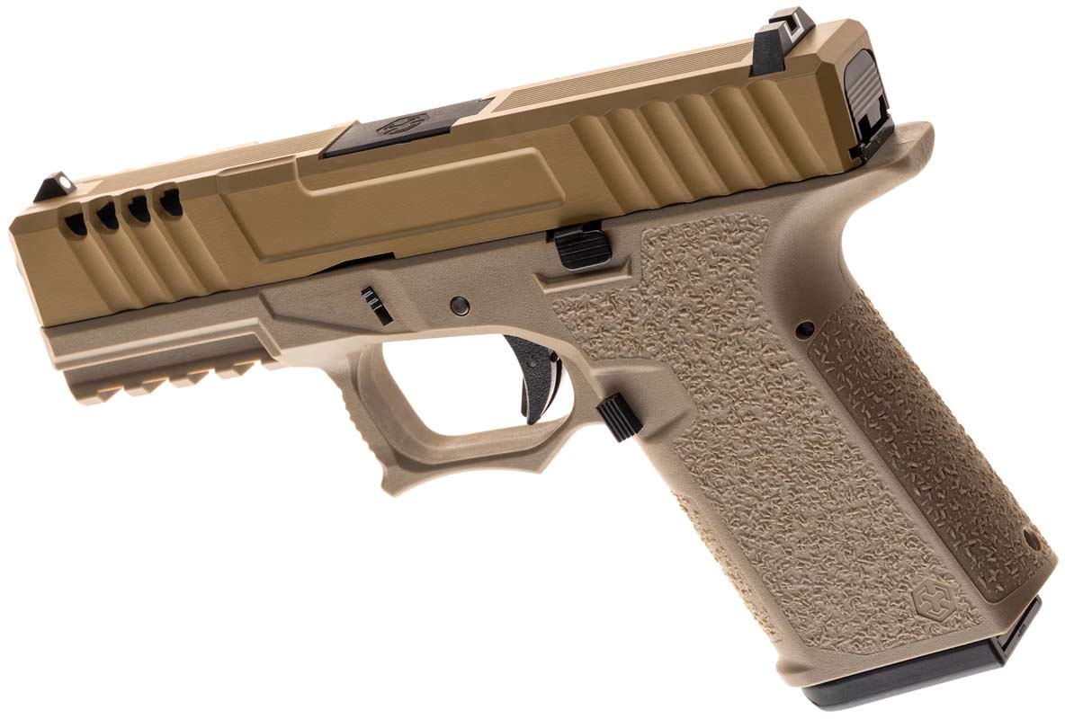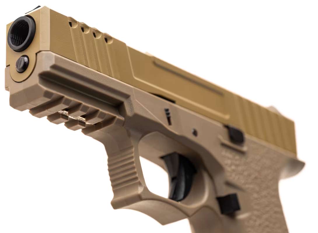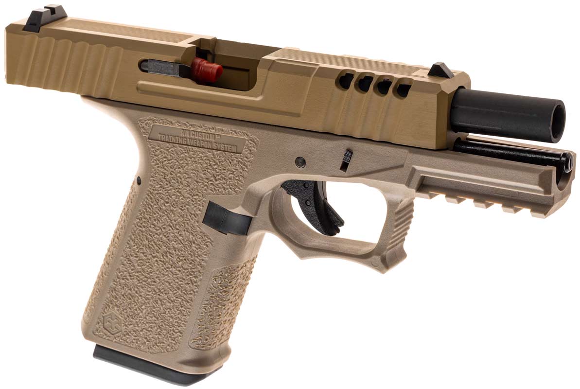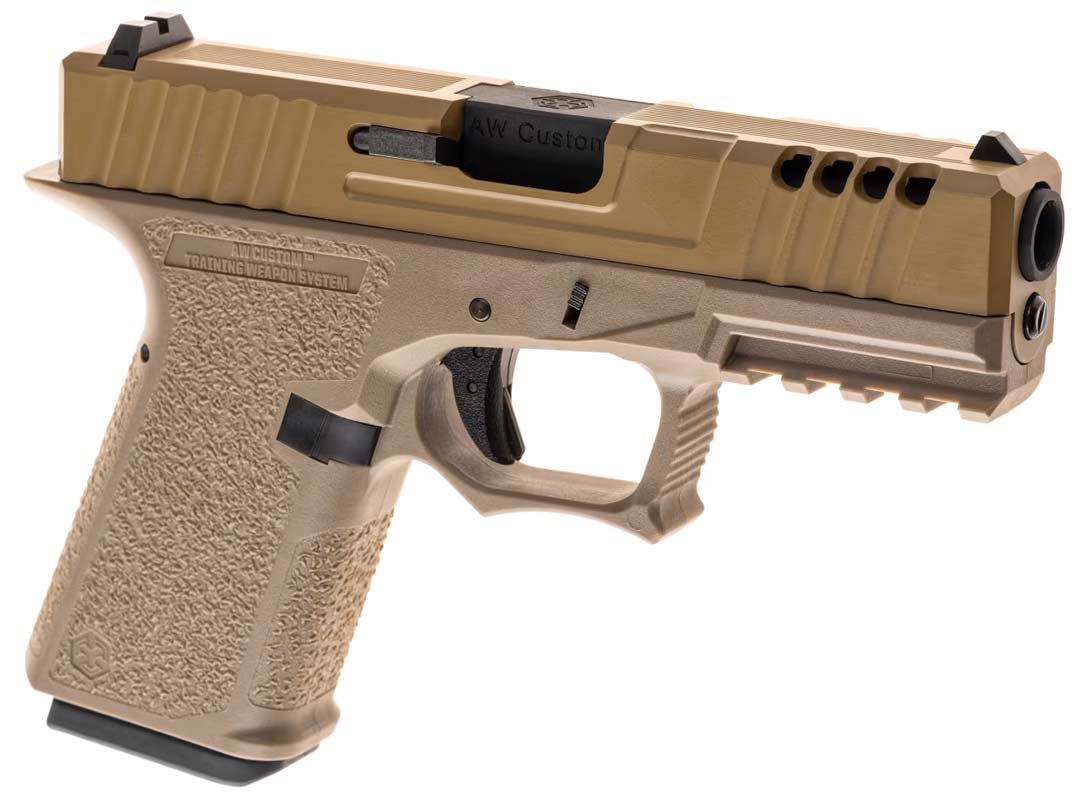 VX9101 FDE Gas Blow Back-pistol från AW Custom som har metall mantel och ABS-fiberram. En extremt bra skjutmodell från AW som ligger bra i handen. Aw Custom VX9101-modellen har urskärningar i sliden och skenan under pipan för montering av diverse utrustning. Ett bra gasvapen som skjuter bra.