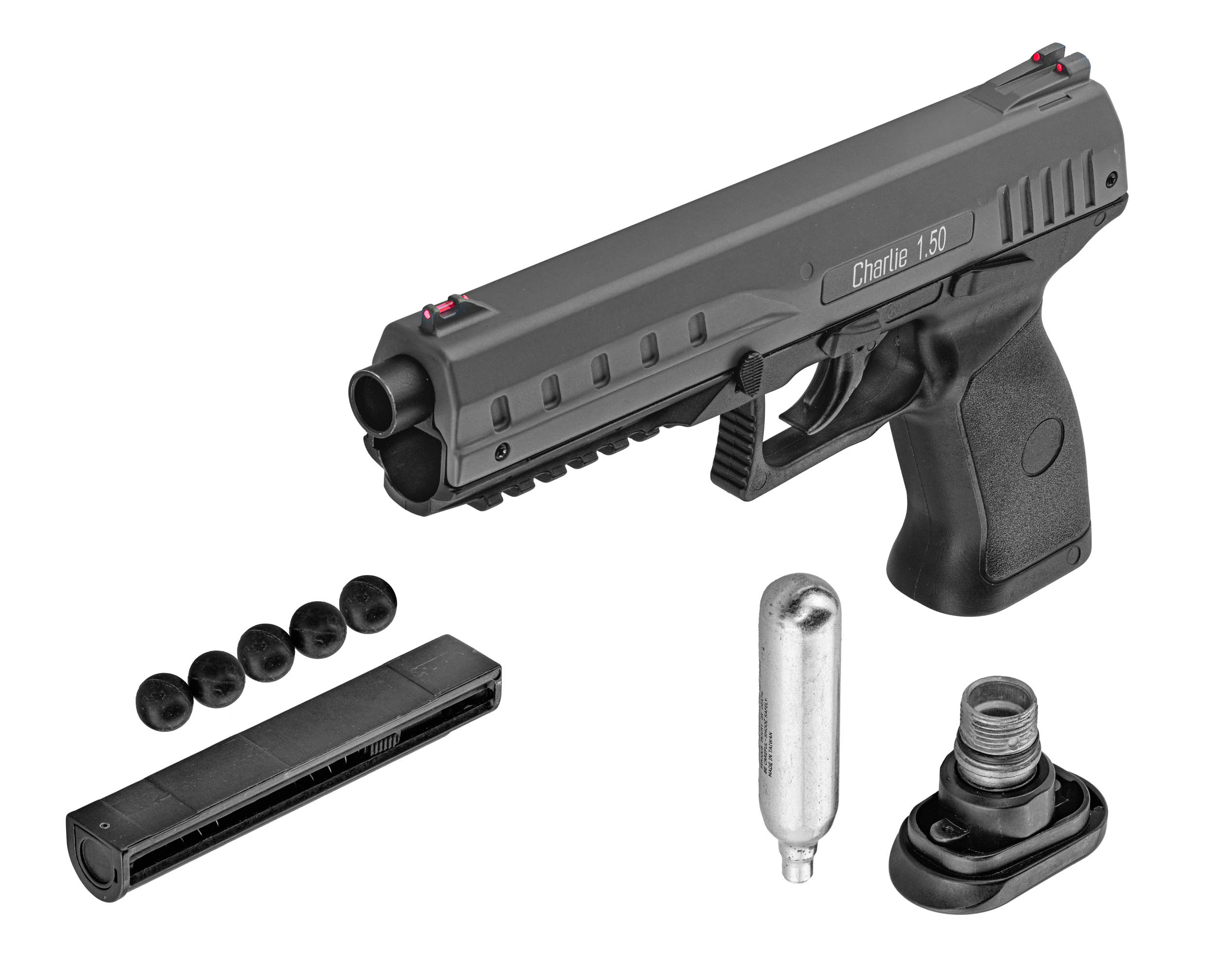 Charlie 1.50 levereras med två avtagbara magasin, som vardera rymmer 5 skott. Det halvautomatiska läget gör att flera skott kan avfyras snabbt och effektivt utan manuell omladdning mellan skotten. Pistolen är kompatibel med gummikulor i kaliber .50 och kan användas med både lätta och tyngre projektiler beroende på syftet.